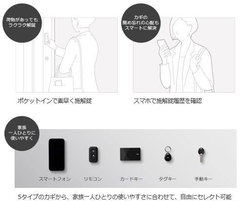 スマートフォンを持っていれば、取り出す必要がなく“ポケットイン”の状態でドアの施錠・解錠が可能なスマートロックシステムを標準搭載。