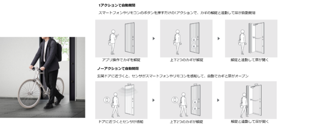 さらに機能面では、スマートフォンを持っていれば、取り出す必要がなく“ポケットイン”の状態でドアの施錠・解錠が可能なスマートロックシステム「FamiLock」を標準搭載しています。オプションには、暗証番号の入力で施錠・解錠が可能な[テンキー付屋外リーダー]や、室内からワンタッチで施解錠でき、自動施錠や自動開閉をアシストする[ワイヤレス屋内ボタン]をご用意しているほか、近づくだけで自動開閉しひと足先に未来の暮らしをお届けする[DOOR OPENER SYSTEM]をお選びいただけます。