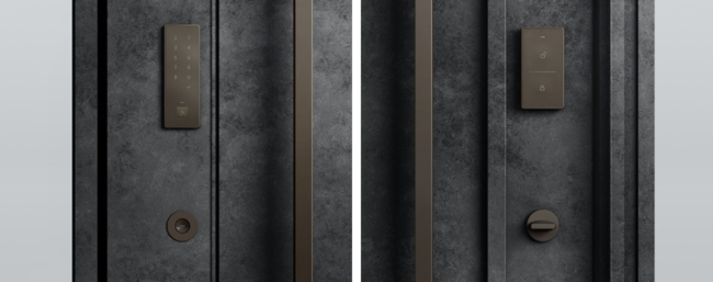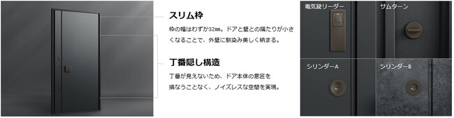 わずか32mmのスリム枠や丁番隠し構造を採用。電気錠リーダーやシリンダー、サムターンといったパーツ類も存在感を抑えたコンパクトでフラットな形状・ドアに馴染むグラファイト色を採用。