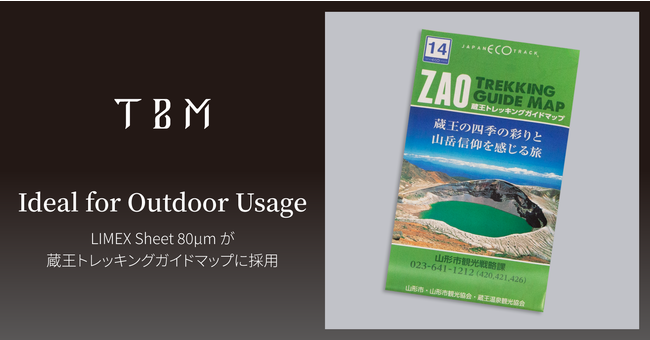 株式会社TBM(本社:東京都千代田区、代表取締役CEO:山崎敦義、以下TBM)は、山形市、山形市観光協会、蔵王温泉観光協会が共同発行する「蔵王トレッキングガイドマップ」に、石灰石を主原料とする「LIMEX Sheet(ライメックスシート)」80μm(白色ソフト)が採用されたことをお知らせいたします。LIMEX Sheet 80μmは現行のLIMEX Sheetの中では最も薄く、経済産業省の補助金が採択され2021年に竣工した当社多賀城工場にて製造されています。本件は同シートがマップに採用された初の事例となります。