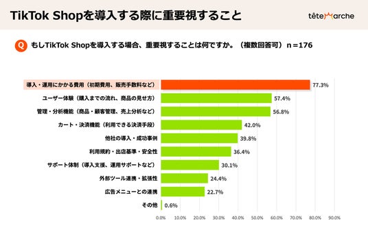 ・実際にTikTok Shopの導入を検討する際に重視する点として、企業の77.3%は「導入・運用にかかる費用(初期費用、販売手数料など)」を挙げた