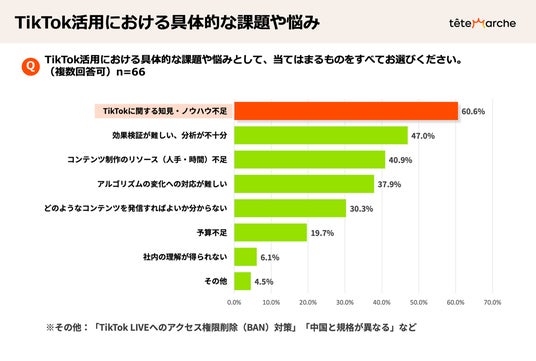 導入に前向きな企業の間でも具体的な課題や悩みに関して、「TikTokに関する知見・ノウハウ不足」(60.6%)、「効果検証が難しい、分析が不十分」(47.0%)、「コンテンツ制作のリソース(人手・時間)不足」(40.9%)といった導入後の運用体制やリソース面に不安を感じる企業も少なくありません。