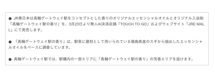 駅開業日より高輪ゲートウェイ駅構内の一部エリアにて、本商品による芳香エリアを設けます。