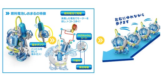 背中にのせたタンクに塩水を注入すると、トコトコとボディーを揺らしながら歩き出します。その秘密は、マグネシウムと空気の化学反応で電気を作り出す燃料電池。燃料電池の不思議なパワーを体験できます。