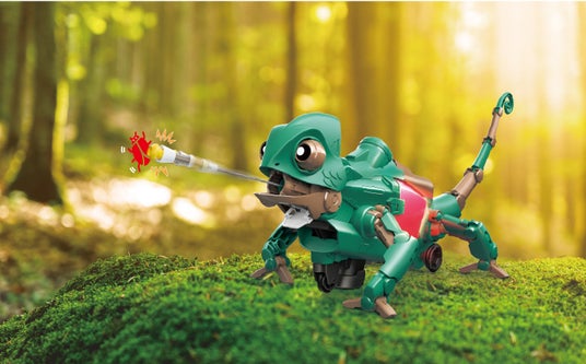 カメレオン型ロボット「メカレオン」は、おなかに搭載されたカラーセンサーで周囲の色を識別し、その色に合わせてボディカラーを変化させることができます。また、付属のカラーシートを使えば、パソコンを使わずに簡単にプログラミングが可能。3つの動作モードを備えており、さまざまな動きや反応を楽しみながら、プログラミング体験ができます。