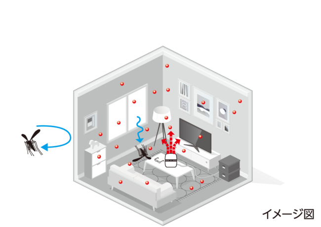 (1)部屋のすみずみまで広がった超マイクロ粒子の有効成分が、蚊の侵入をブロックします。