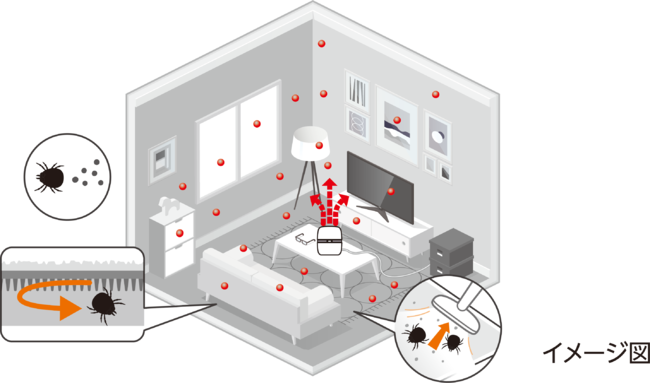 (2)部屋のすみずみまで広がった有効成分が、ダニを無力化し、掃除機で除去しやすくなります。また、カーペットやソファに潜むダニも無力化され這い上がることができなくなるため、表面には出てこなくなります。
