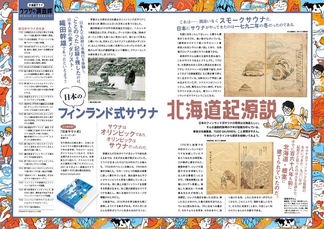 北海道発の人気サウナ番組『&sauna』のロケに密着したり、日本のフィンランド式サウナが北海道を起源とする説を調査したり、国産のヴィヒタ農家に潜入したり……施設紹介のほかにも気になる企画が盛りだくさん!どれも北海道のサウナシーンの盛り上がりを感じられるような、読み応えのある記事になっています。巻頭にはタナカカツキ先生、巻末にはヒャダインさんのサ旅エッセイも掲載。
