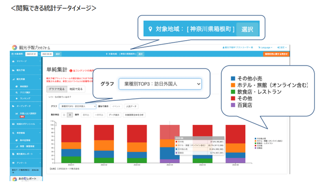 自治体・観光協会・DMO・企業に対して、地域の活性化やサービス事業者の生産性向上のため、宿泊情報を中心とした「観光」関連データをエリア単位にまとめて提供可能なプラットフォーム。事業者は、これらのデータを活用し、利用者の属性を把握することで、ターゲットや施策の明確化が可能。(※一部メニューは有償)
