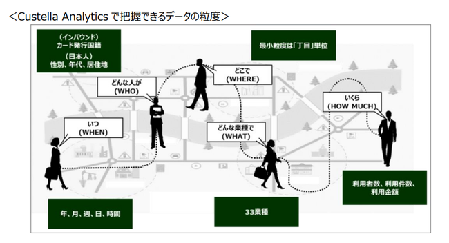 「観光予報プラットフォーム」で捕捉しきれなかった場合は、弊社のデータ分析サービス「Custella Analytics」による詳細分析も可能です。「Custella Analytics」は、自治体や企業などが抱えている課題やニーズを個別にヒアリングし、完全オーダーメイドの分析を行うレポーティングサービスです。観光客が「いつ」「どこで」「どんな人が」「何を」「いくら」決済したかといった情報をクロスで集計・分析することで、観光振興につながる最適な施策設計の支援が可能です。具体的な分析により、広告配信のターゲットや、消費促進施策の内容検討に活用いただくことができます。