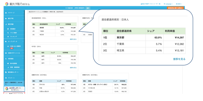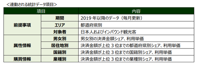 2022年10月より、三井住友カードが保有するキャッシュレス統計データの連動により、観光予報プラットフォームにおいて、国内観光客・インバウンドの消費動向データが無償で閲覧可能となります。具体的には、全都道府県別に、消費が多い観光客の属性やエリア内の加盟店業種の上位3位までのシェアを可視化するなど、消費実態の一部を把握することができます。