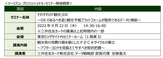 2022年9月22日(木)~23日(金・祝)に開催される「ツーリズムEXPOジャパン2022 『トラベルソリューション展2022』」において、観光予報プラットフォーム協議会が出展します。本ブースにて、観光予報プラットフォームの消費データ閲覧を体験いただけます。当日は、三井住友カードの担当者もブースに常駐し、消費データ閲覧やCustella Analyticsを活用した観光消費動向調査のご案内等を行いますので、是非ご参加ください。