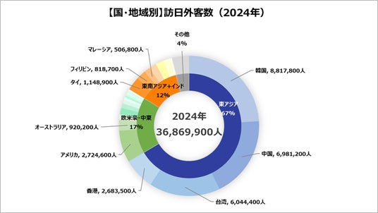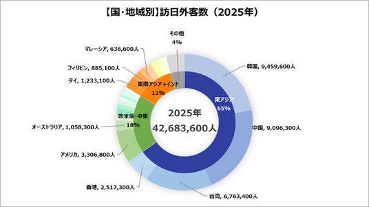 国・地域別では、1位が韓国945万人(2024年対比+64万人、+7.3%)、2位が中国909万人(2024年対比+211万人、+30.3%)、3位が台湾676万人(2024年対比+71万人、+11.9%)となりました。