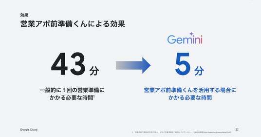 「営業アポ前準備くん」の利用により、1回の営業準備にかかる必要な時間は43分から5分まで、1/8の短縮に成功しました。