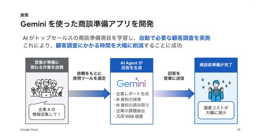 『営業アポ前準備くん』は、営業活動時のアポイント前の準備にかかる企業調査やIR 情報の読み込み、課題の仮説立てなど、あらゆる準備業務を Gemini が担当できるように開発した AI エージェントです。