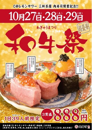 「肉寿司」と「0 秒レモンサワー」のコラボ店舗を3店舗連続オープンしたことを記念して、キャンペーン実施店舗※ にご来店のお客様を対象に「超豪華和牛祭」を開催いたします。「超豪華和牛祭」では、1 日 39 人前限定でトロ肉 をふんだんに使った肉寿司 3 貫盛を、税込 976 円(税抜 888 円)でご提供いたします。