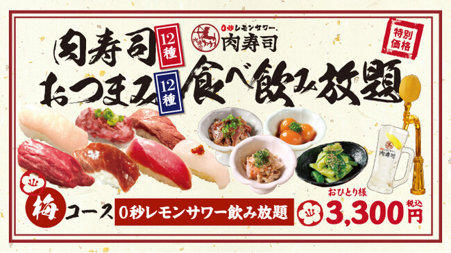 【梅コース】0秒レモンサワー付!肉寿司12種+おつまみ12種食べ飲み放題90分3,300円(税込)