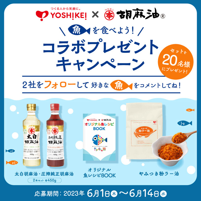 年間約3,300種類のメニューを販売するミールキットの老舗と、毎日の食卓で楽しめる、幅広いラインアップを取りそろえたごま油の老舗がタッグを組み、新たな魚メニューの楽しみ方を提案します。プレゼント内容は、『マルホン胡麻油セット』、ヨシケイオリジナルブランド「YOSHIKEI SELECT」の人気商品『やみつき粉ラー油』、プレゼント商品を使用した『オリジナル魚レシピBOOK』の豪華3点セットをプレゼント。また、キャンペーン期間中には、双方の公式SNSにて『オリジナル魚レシピBOOK』内のレシピや魚の魅力について投稿します。