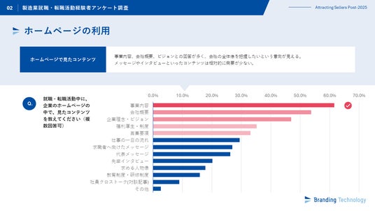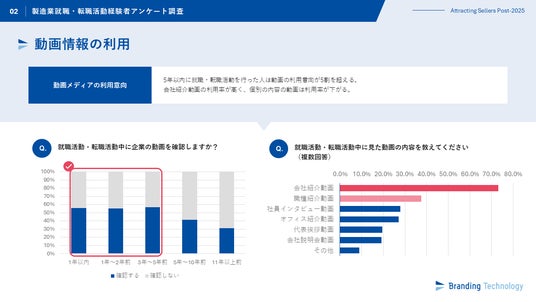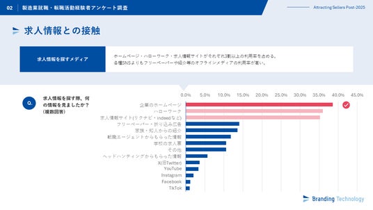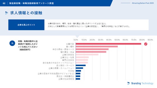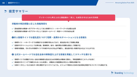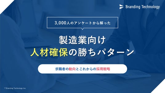 ブランディングテクノロジー株式会社(代表取締役社長:木村 裕紀、本社:東京都渋谷区、証券コード:7067)は、製造業の採用担当者・経営者を対象に、今後の人材確保に役立つ調査資料「3,000人のアンケートから解った『人材確保の勝ちパターン』~求職者の動向とこれからの採用戦略~」を公開しました。本資料では、3,000人に実施したアンケート調査をもとに、求職者の情報収集行動、企業選びの基準、採用ページの役割などを分析し、成功する採用戦略の方向性を提言しています。