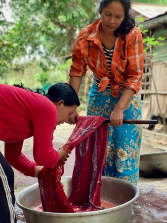 カンボジア内戦で失われた伝統絹織物の復興に始まり、現在は布作りを通して持続可能な環境作りを行う。機械を使わず布の材料から全て手作りのシルク100%のスカーフ。