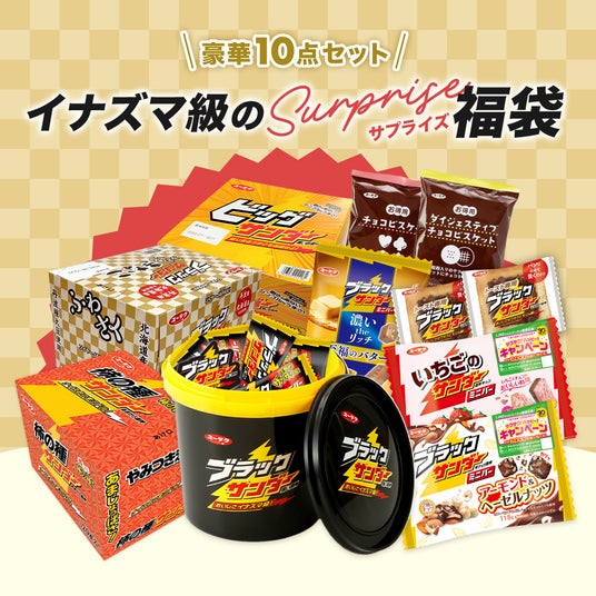 「ブラックサンダー福箱」のほかに、お求めやすい「福袋セット2025」も数量限定でご用意しております。有楽製菓の商品10種を詰め合わせたお得な商品です。