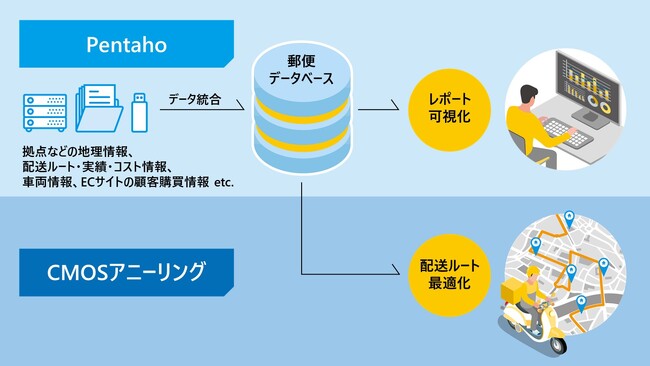 具体的には、ベトナム郵便がDXを進めていく上での、デジタルインフラの中核となるデータベース構築をめざし、日立のデータ管理・分析ソフトウェア群Pentaho, an intelligent Data Ops platform(以下、Pentaho)を活用することで、業務ごとに分散している配送・車両・顧客などに関するデータの中から、格納するデータの選定や、統合・分析方法、利活用のユースケースを検討します。また、現在の中核事業である郵便・物流において、疑似量子コンピュータとも呼ばれる日立独自のCMOSアニーリング*1を活用することで、大規模かつ複雑なデータの中から、最適な配送計画を作成し、物流業務の効率化を検証します。
