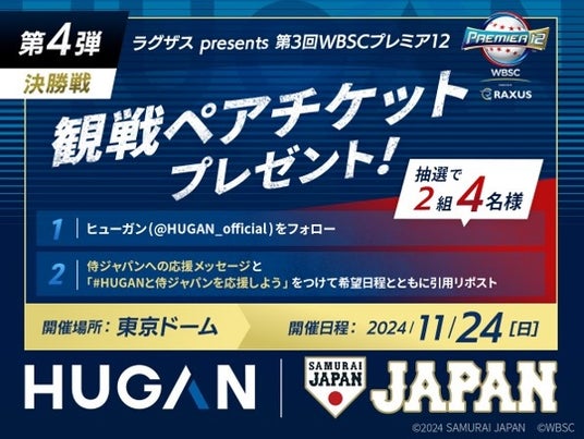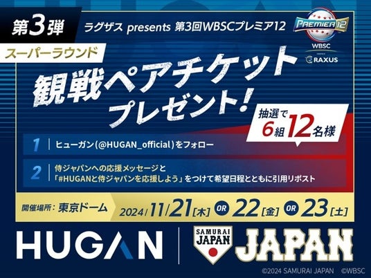 「HUGAN侍ジャパン応援プロジェクト」の一環として、「ラグザスpresents第3回WBSCプレミア12」のスーパーラウンドのチケットが当たるキャンペーンを開催します。期間限定の特別キャンペーンとなりますので、ぜひチェックしてください。