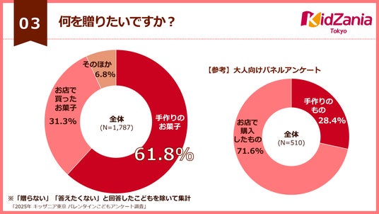 一方、同期間に実施した大人(16歳以上)向けのアンケートでは「手作りのものを贈る派」が28.4%、「お店で購入したものを贈る派」が71.6%でした。