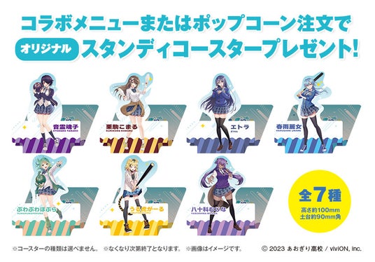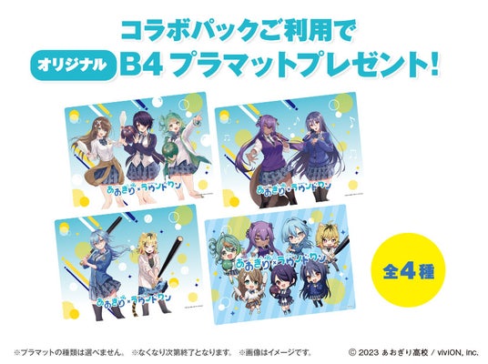 ボウリング、カラオケ、スポッチャをご利用時に『あおぎり高校』のコラボパックをご選択いただくと、コラボパックノベルティ(B4プラマット)を1つランダムでプレゼントします。
