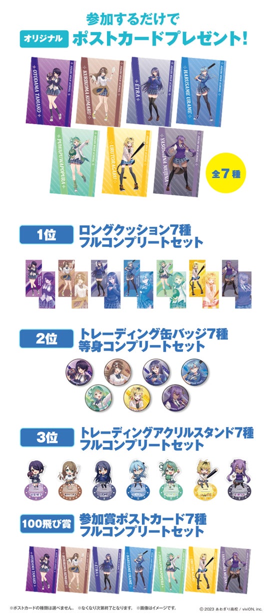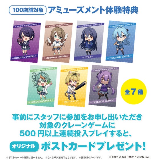 このプライズと連動して、事前に店舗スタッフに参加をお申し出いただき対象のクレーンゲームに500円以上連続投入プレイすると、オリジナルポストカード(全7種)をランダムでプレゼントするキャンペーンも実施いたします。