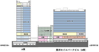 B棟である豊洲セイルパークビルは、オフィス、店舗に加え、インキュベーション施設「LIFESTYLE LAB “TOYONOMA”」(総床面積 約1,500平方メートル )、シェア企業寮「TRIAL HOUSE “TAMESU”」(総戸数39戸)等、豊洲エリアにこれまでなかった機能を導入します。また、本街区内に開発されるオフィスビルのA棟や、大屋根広場、街区周縁部の豊かな緑地空間の整備等を通じて、本計画が新たな交流・発信拠点となることを目指します。