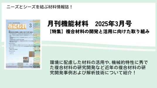 化学・エレクトロニクスなどの技術・市場動向レポート発行を行う、株式会社シーエムシー出版は、雑誌『月刊機能材料2025年3月号』を3月7日に発売しました。今回の特集「複合材料の開発と活用に向けた取り組み」では、生分解性複合材料や廃棄物由来ポリマーコンポジットなど低環境負荷や、機能性複合材料の組織制御など高機能化技術を取り上げております。