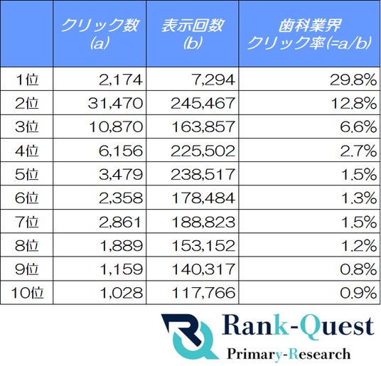 【SEO対策】で検索結果No.1を獲得した(注1)ランクエスト(https://rank-quest.jp/column/column/how-to-seo/ )は、2025年7月において歯科業界のクライアントサイトで上位10位以内にランクインした6,833件の歯科関連キーワードを対象に検索順位ごとのクリック率(CTR)を分析しました。