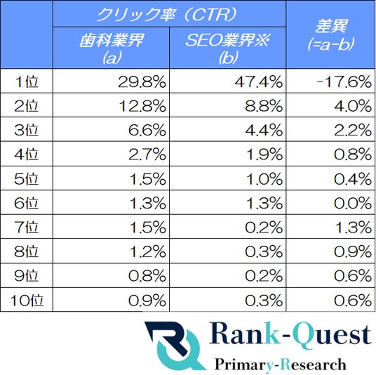 さらに、SEO業界向けの自社サイト(注2)のクリック率データと比較することで、歯科業界特有のクリック傾向やユーザー行動の違いも明らかにしています。
