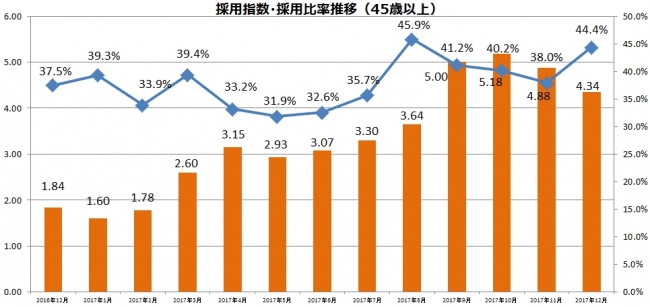 ※ 【棒グラフ】 採用指数=当月の「45歳以上の採用数」÷2016年7月の「 45歳以上の採用数」/【折れ線グラフ】 採用比率=当月の「 45歳以上の採用数」÷当月の総採用数