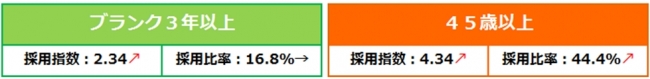 ※ 【棒グラフ】 採用指数=当月の「ブランク3年以上の採用数」÷2016年7月の「ブランク3年以上の採用数」/【折れ線グラフ】 採用比率=当月の「ブランク3年以上の採用数」÷当月の総採用数