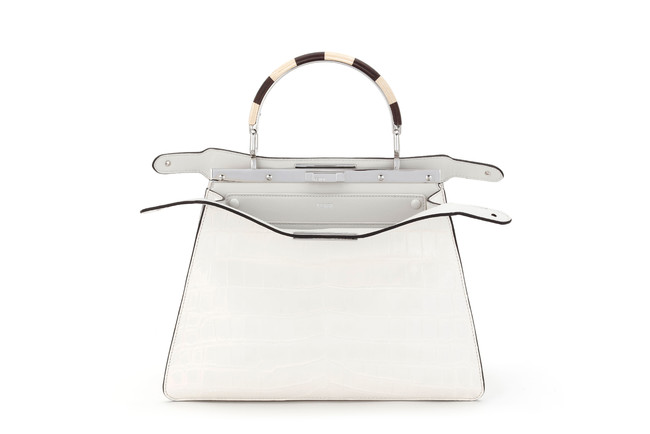 ホワイトのクロコダイルに、光沢仕上げを施したホワイトレザーを裏打ちし、アイコニックなペカン(Pequin)モチーフのハンドルとパラジウムのメタルパーツをあしらったミディアムサイズの「ピーカブー アイシーユー(Peekaboo ISeeU)」バッグが、同店にて限定販売されます。