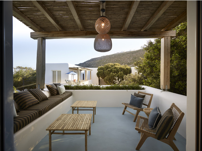 2ヶ所設けられたテラスには、床のライトブルーの樹脂と、ラフィアとバンブーの調度品により、内部の雰囲気がそのまま続くようにデザインされています。さらに手作業で彩色された陶の花瓶が空間を美しく飾ります。