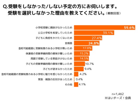 小学校受験の選択に至らなかった理由として最も多かったのは「興味がなかった」(59.6%)でした。