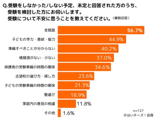非受験・受験未定の家庭のうち、受験を検討している層の主な動機は「子どもの成長への期待(または不安)(58.3%)」と「子どもが安心できる環境(55.1%)」で、子どもの成長や環境を重視して検討に至るケースが多いことが分かりました。また、検討者の56.7%が「金銭面に不安を感じている」と回答しており、検討段階で経済的負担が大きな懸念となっている実態も浮き彫りになりました。