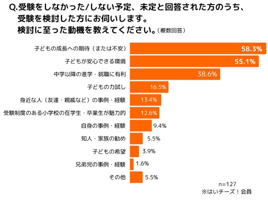 非受験・受験未定の中で「受験を検討した」と回答した127名にその動機を尋ねたところ、最も多かったのは「子どもの成長への期待(または不安)(58.3%)」、次いで「子どもが安心できる環境(55.1%)」という結果になりました。子どもの成長や環境を重視して受験を検討する家庭が多いことがうかがえます。