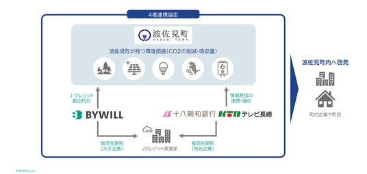 バイウィルは、波佐見町におけるJ-クレジット創出プロジェクトの登録・申請からモニタリング、創出したクレジットの販売までをシームレスに支援します。また、販売に関しては、十八親和銀行、テレビ長崎とも協力し、「地産地消」によって波佐見町をはじめとする地域の脱炭素化を促進します。