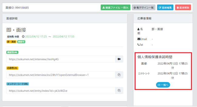 これまでも、この個人情報保護方針(個人情報の取り扱い)への同意時間をエビデンスとしてSOKUMENシステム側に残しており、各面接毎に確認をすることができる状態でした。