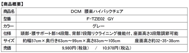 全国でホームセンター事業を展開するDCM株式会社 東京都品川区、代表取締役社長: 石黒靖規以下、DCM)は頭部・背部・腰部の角度をリクライニング機能で調節し、お好みの姿勢で座ることができる「DCM 腰楽ハイバックチェア」を2022 年 4月15日(金)より、全国のDCMグループ店舗(DCM・DCMカーマ・DCMダイキ・DCMホーマック・DCMサンワ・DCMくろがねや及びケーヨーデイツー、一部店舗を除く)にて発売します 。