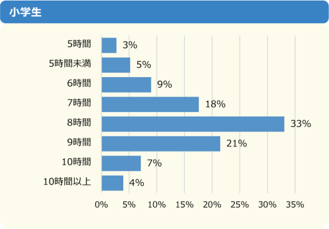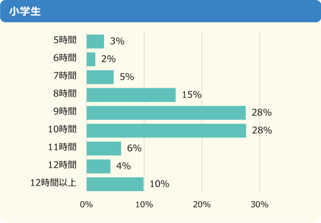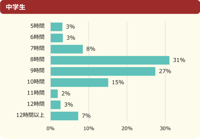 小学生は「7時間」「8時間」「9時間」のいずれかを回答する人が多く、全体の72%を占めていました。一方で中学生は小学生より1時間ずれて、「6時間」「7時間」「8時間」が大半を占めています。