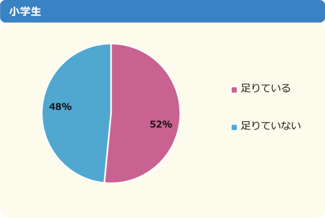 平日の夜は「夜10時頃」に寝る人が30%と最も多く、休日の夜は「夜11時頃」に寝る人が25%、「夜10時頃」は24%と、休日は平日に比べて夜更かしする人が増えるようです。また「睡眠時間は足りている?」という質問では、全体の54%が「足りていない」と回答しており、足りていない理由を尋ねたところ、「家での勉強に時間がかかる」「YouTubeなどの動画を見ている」「塾で帰りが遅い」などが主な理由としてあがっていました。
