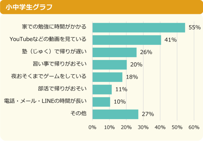 「睡眠時間が足りていない理由」のトップ3は、第1位「家での勉強に時間がかかる」、第2位「YouTubeなどの動画を見ている」、第3位「塾で帰りが遅い」でした。「その他」に寄せられた回答の中には「早めに布団に入ってもなかなか寝つけない」「寝ようと思ってもすぐには寝られない」などの意見が集まりました。