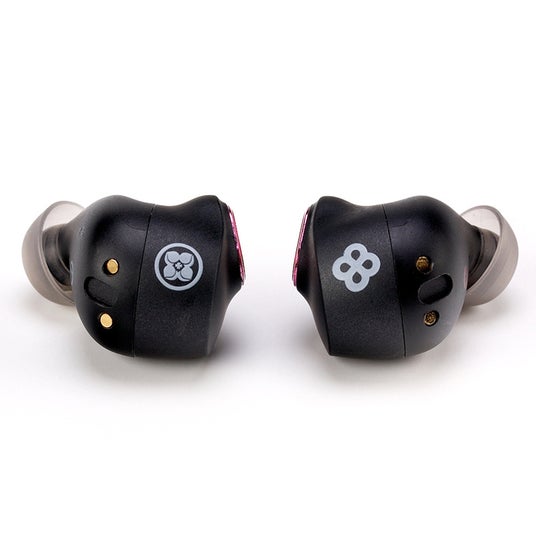 チャージングケースにはももクロとAVIOTを融合させたコラボイヤホン限定デザインのロゴを配置。イヤホン本体には15周年のアイコンと、家紋を配置し、ももクロならではの仕様になっています。シックなブラックをベースカラーに、カラフルなロゴと、ローズピンクのメタルパーツが程よいアクセントに。