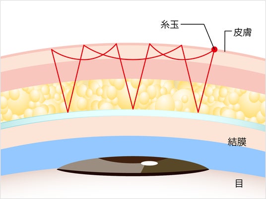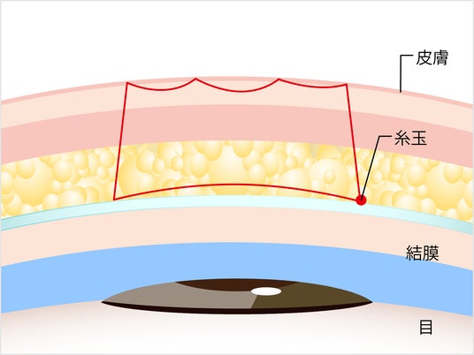 経結膜法のイラスト:皮下と結膜下に糸をスクエア型に通し、結紮点を結膜下に留置する