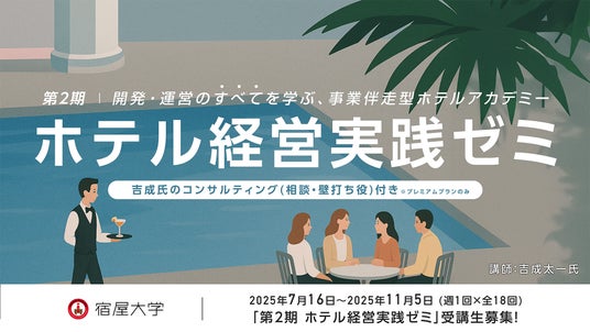 株式会社ダイブ(東京都新宿区 代表取締役社長:庄子潔、証券コード151A)の子会社である株式会社宿屋塾(東京都新宿区 代表取締役社長:山本拓嗣)は、2025年7月16日より「第2期ホテル経営実践ゼミ」を開講します。多くの受講生から好評を得た本ゼミでは、スモールラグジュアリーホテルの運営、ホテルスタートアップ支援、支配人育成、PMS開発など約50のホテルに携わってきたホテリエ・吉成太一氏が講師を務め、実務に即した“リアルな学び”を通じて、宿泊業の未来を担う経営人材の育成を目指します。